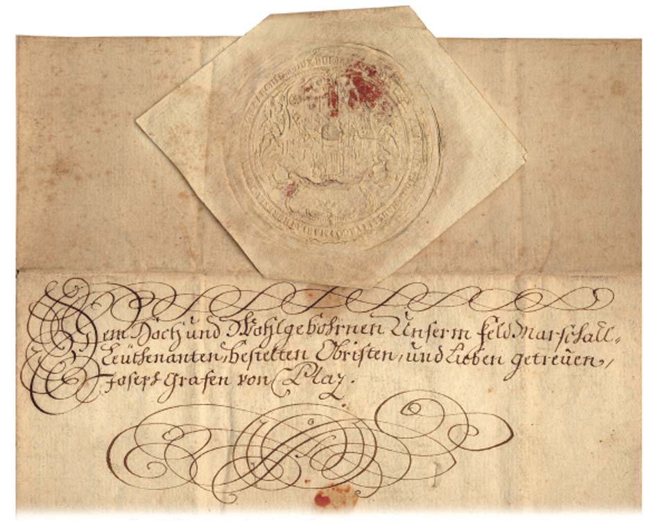 Hoch und wohlgebohrener, lieber Getreuer, Wir haben für Unseren Dienst nöthig zu seyn befunden, Unser in Italien stehende Kriegscorpo noch mit einig mehreren Generalen zu versehen und neben anderen auch Dich aus deme zu Deinen langwährigen Diensten jederzeit erwiesenen Tapferkeit und guten Experienz, dan ansonsten besitzenden lobwürdigen Aigenschaften tragenden gnädigsten Vertrauden dahin zu schicken entschlossen habe. Als Bedeuten Wir es Dir hiermit zur Nachricht, und zudem noch, auf das Du Dich nach beschehner Ablösung von Deinem dermahligen Posto nach gedachtes Italien verfügen unter Comando Unseres Feldmarschallens Fürsten von Lobkoviz der kriegs-gebräuchig Subordination gemäß die Deinem Caracter zukommende Dienste laisten, folglich nach Deiner besitzenden Militar-Erfahrnus und bishero bezeügtem rühmblich Eifer bestmöglichst beförderen zu helffen befließen seyn mögest, ihme nur beyfügend: wasmassen Du Deine Gage bis Ende nächstkünftigen Monaths Aprilis nebst dem winterlichen Beytrag heraussen á 1. May an aber aus der italienischen Kriegs-Cassa zu empfangen habest. Womit Wir Dir mit königlichen Gnaden wohlgewogen verbleiben.