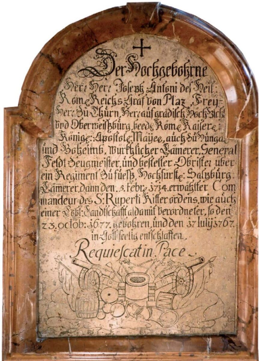 Am 17. Juli 1767 starb Josef Anton Graf Plaz im 90. Lebensjahr als „k.k. wirkl. Kämmerer, Feldzeugmeister, Oberst-Inhaber über ein Regiment zu Fuß, Hochfürstlich Salzburgischer Kämmerer, Einer löblichen Landschaft kleineren Ausschuss Mitverordneter und Landmann, Kommandeur des St. Ruperti Ordens“, nach 2 jährigem Krankenlager.34