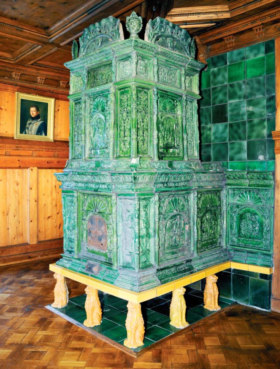 Im Zuge der Renovierungsarbeiten im Schloss wurde im Jahr 2007 der gewaltige Repräsentationsofen im ehemaligen „Salon der Gräfin Eleonore von Plaz“, der heute für Trauungen ebenso wie für Seminare und Tagungen zur Verfügung gestellt wird, instand gesetzt. Der Salon befindet sich an der Stirnseite des Osttraktes im ersten Obergeschoss. Der Ofen wurde von den Hafnern Franz und Cyriak Klieber aus Altenmarkt im Pongau gereinigt, neu verfugt und es wurden einzelne schadhafte Kacheln kopiert und ersetzt. Zur historischen Baugeschichte dieses Raumes ist vorauszuschicken, dass ab 1608 der groß angelegte Umund Erweiterungsbau des Schlosses durch Karl Jocher erfolgte, wobei sich noch einige Skizzen für die Tür sowie die Kassettendecke des Salons aus den Jahren 1615/20 erhalten haben. Der gesamte Raum ist mit einer aufwändigen Holzvertäfelung verkleidet. Der wuchtige, 295 cm hohe Repräsentationsofen wurde an die Nordwand des Raumes angebaut und steht somit direkt neben der Eingangstür. Es handelt sich dabei um einen grün glasierten2 Turmofen auf dunkelgelb glasierten Löwenfüßen.3 Als nicht sichtbares, tragendes Gerüst dient eine Skelettkonstruktion aus Eisen. Das Basisgesims aus unverzierten gelben Verkleidungskacheln wurde erst im Rahmen der Restaurierung im Jahr 2007 angebracht. In der heute sichtbaren Fasson ist der Ofen als Vorderladerofen konzipiert, das heißt, seine Beheizung erfolgte von der Stube aus.